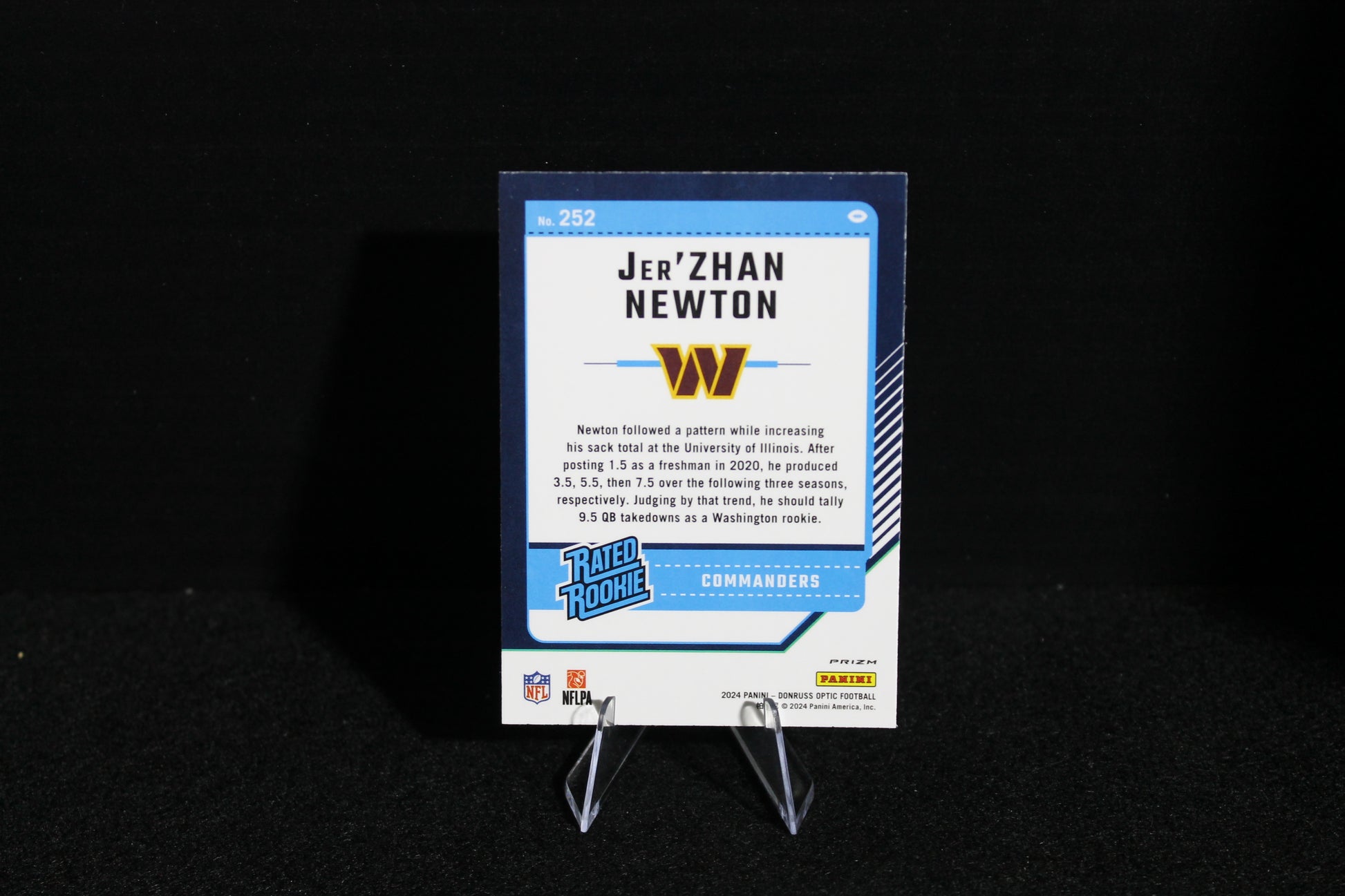 This Jer'Zhan Newton 2024 Donruss Optic Green Velocity Rated Rookie showcases the disruptive defensive tackle with exceptional card technology. The distinctive green velocity pattern creates superior visual impact against the premium Optic chromium surface. Newton's combination of first-step explosiveness, interior pass-rush ability, and backfield penetration skills makes this parallel particularly valuable for collectors focusing on defensive line talent. A significant acquisition for serious football card enthusiasts specializing in impact interior defenders and limited-production parallels with strong long-term investment potential.