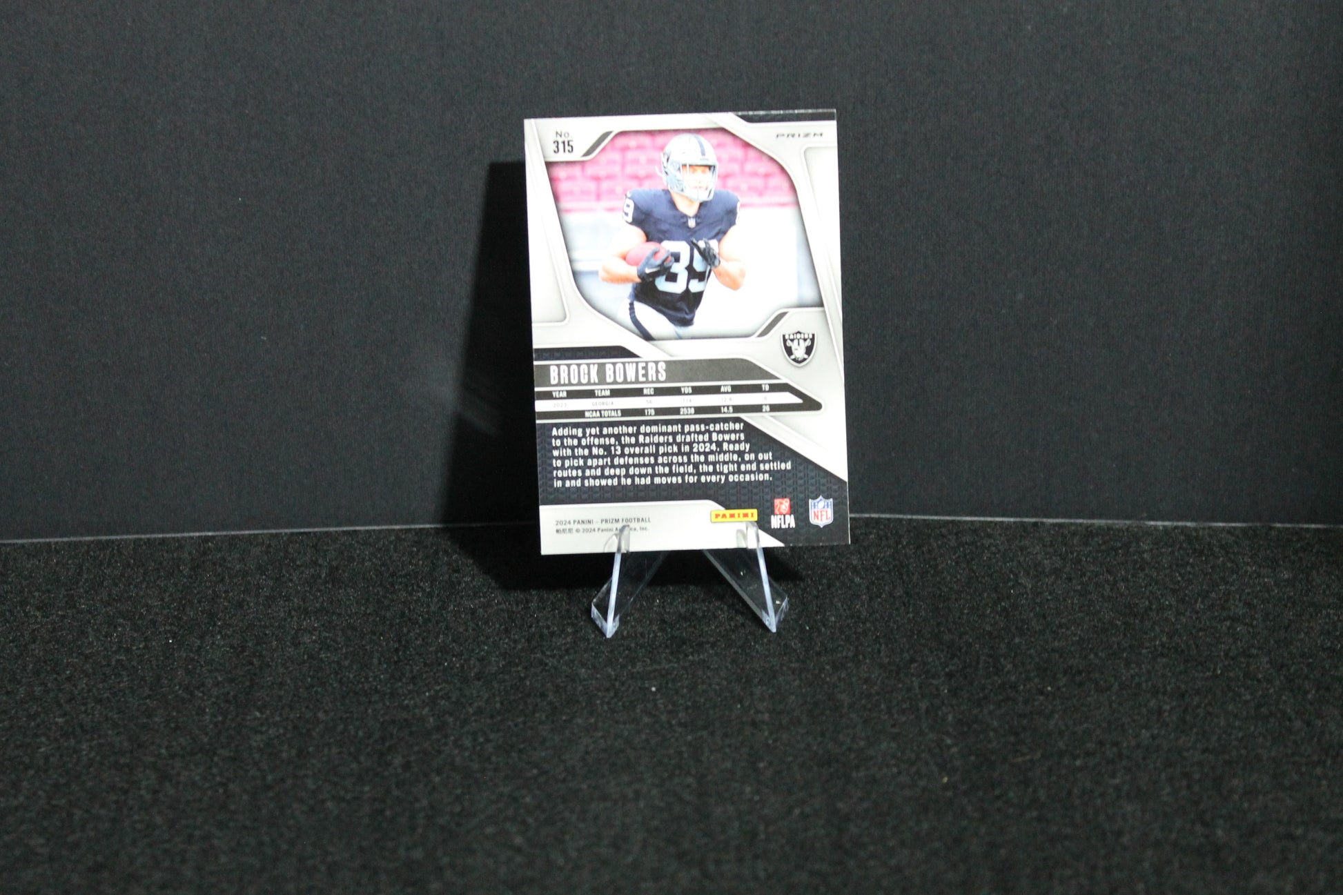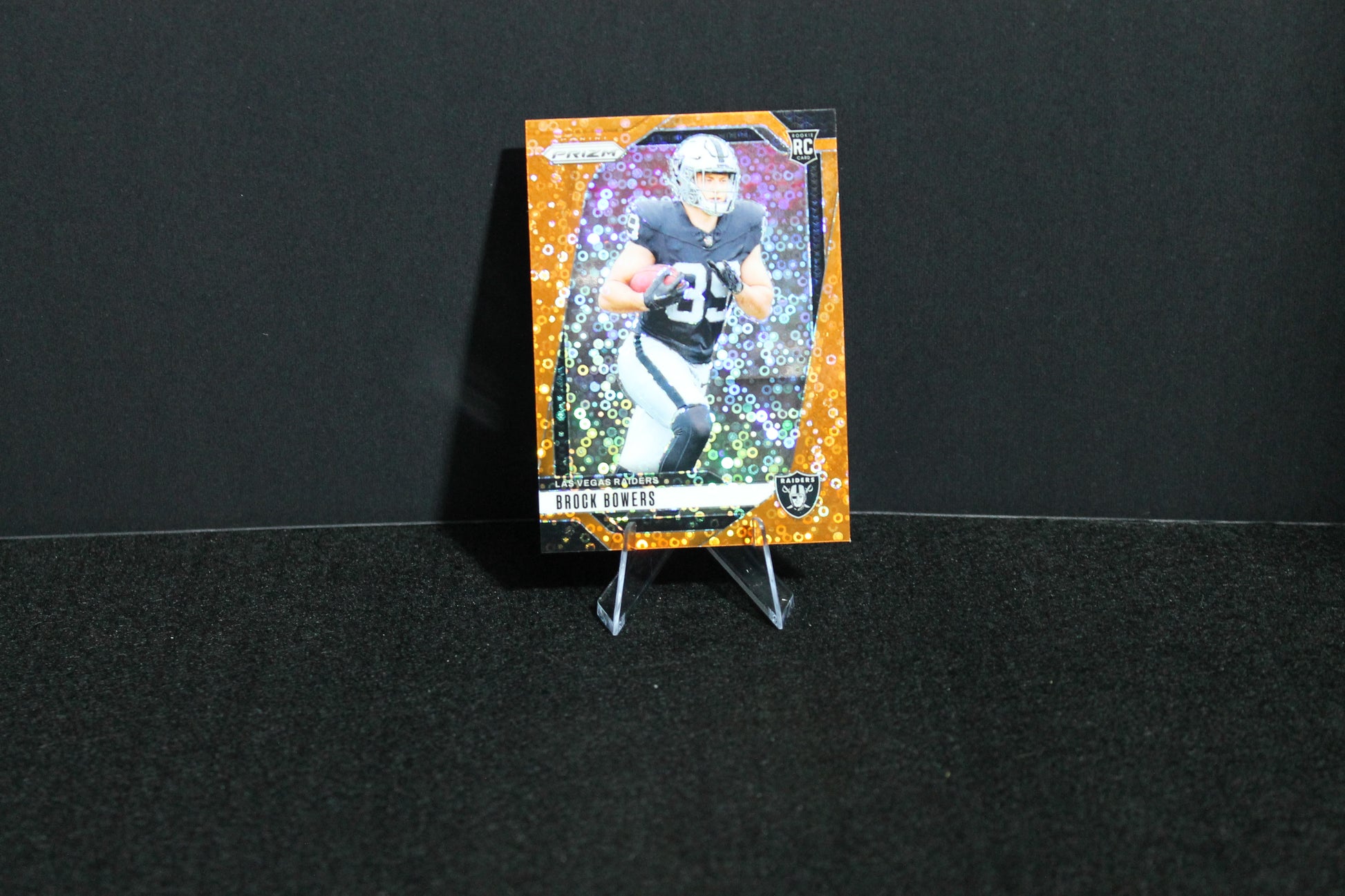 Brock Bowers’ 2024 Panini Prizm Disco Rookie card features the signature Disco parallel design, combining vibrant colors with a dynamic pattern that captures the energy of his rookie season. This card offers collectors a premium, visually striking piece that highlights Bowers’ emerging talent. Its limited print run and high-quality finish make it a valuable addition for those focused on acquiring promising rookies with strong investment potential.