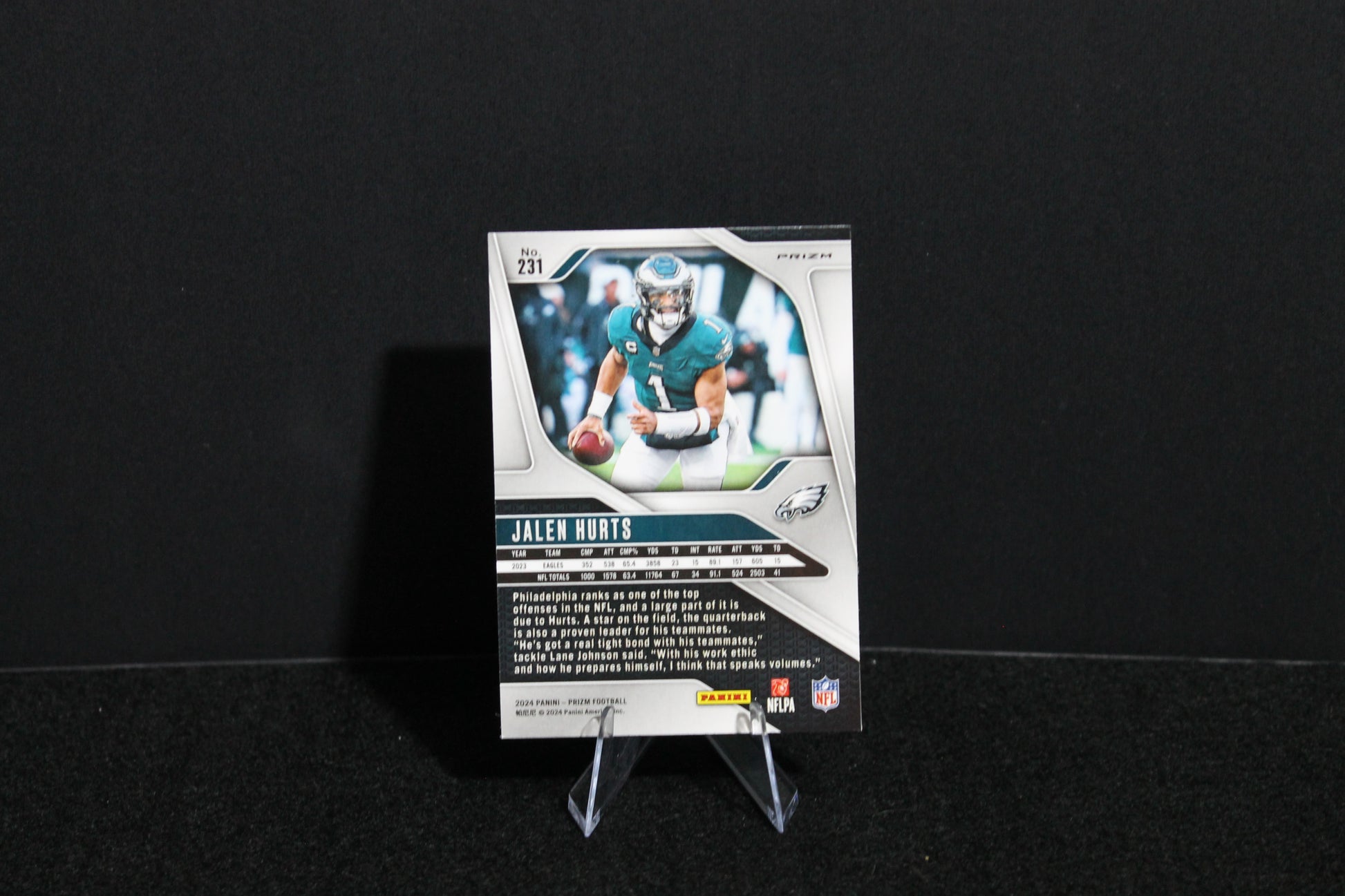 The Jalen Hurts 2024 Panini Prizm Pink Wave card features the dynamic quarterback with a vibrant pink wave design that enhances its visual impact. Crafted with premium printing and sharp detailing, this card is a prized collectible for enthusiasts tracking Hurts’ rising NFL career. Its limited production and distinctive aesthetics make it a valuable addition for serious collectors and investors alike.