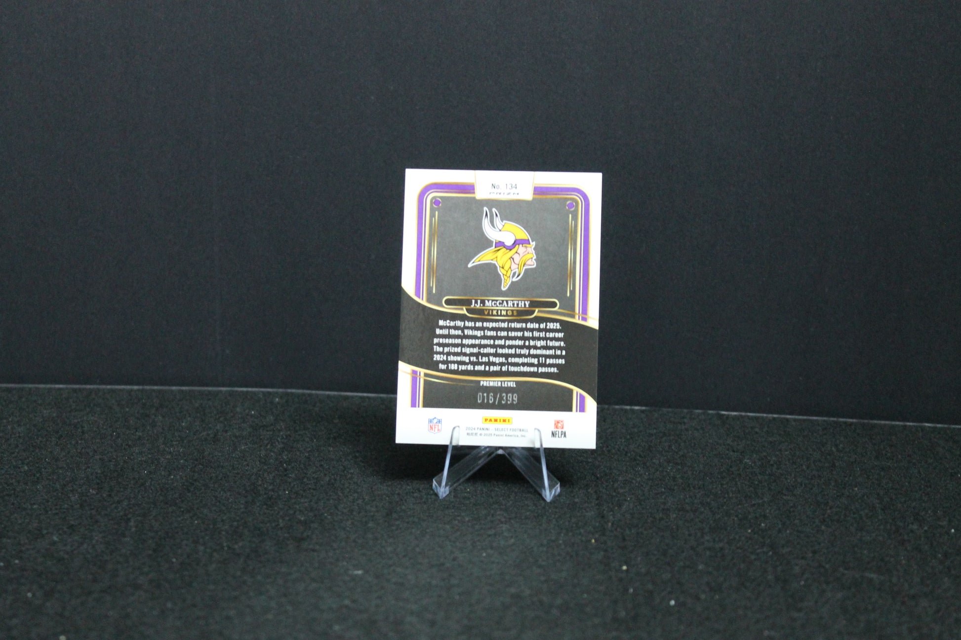 The J.J. McCarthy 2024 Select Football Orange Shock /399 Premier Level Rookie card features a vibrant orange shock parallel limited to 399 copies. Showcasing McCarthy’s promising rookie season, this Premier Level card combines striking design with rarity, making it a valuable collectible for expert football card enthusiasts and investors focused on emerging talent.