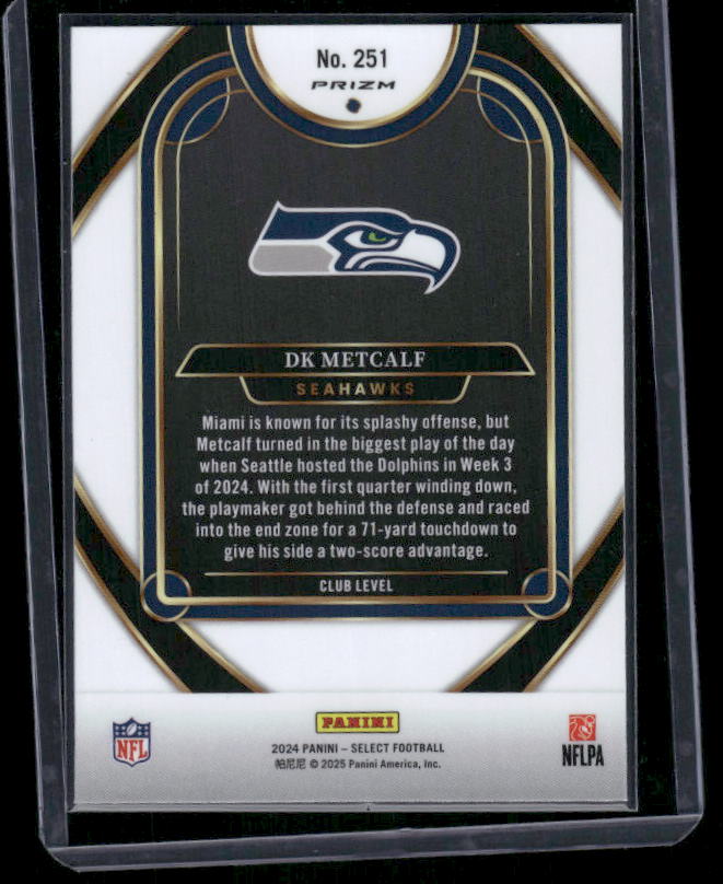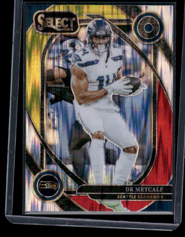DK Metcalf’s 2024 Select Football Red / Yellow Shock Club Level card features a bold red and yellow shock design that captures his explosive athleticism. Produced with Select’s high-quality standards, this card offers collectors a dynamic and visually striking piece, perfect for highlighting one of the NFL’s most powerful wide receivers in a premium football card collection.