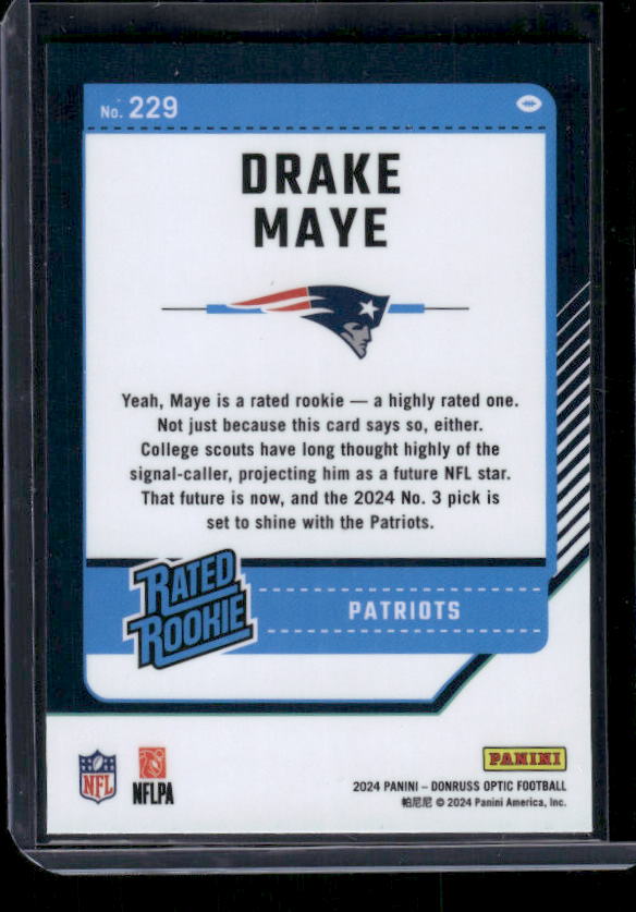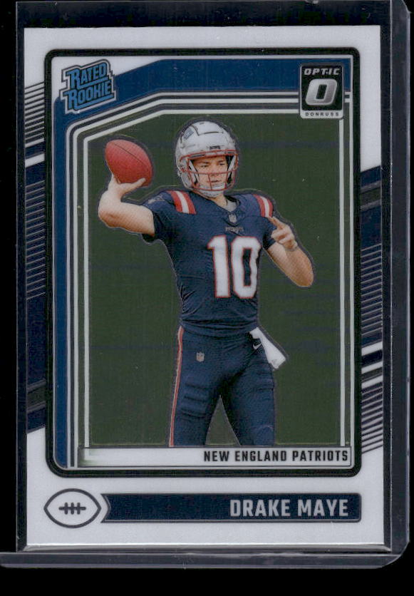 Drake Maye's 2024 Donruss Optic Rookie card showcases the quarterback's potential with a sharp, vibrant design that highlights his entry into the professional arena. This rookie card combines high-quality optics and detailed imagery, making it a valuable addition for collectors focused on emerging talent. Its premium presentation and rookie status position it as a key piece for building a forward-looking football card collection.