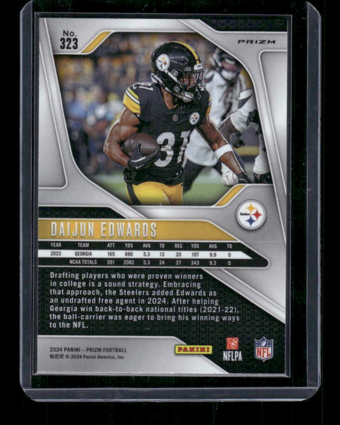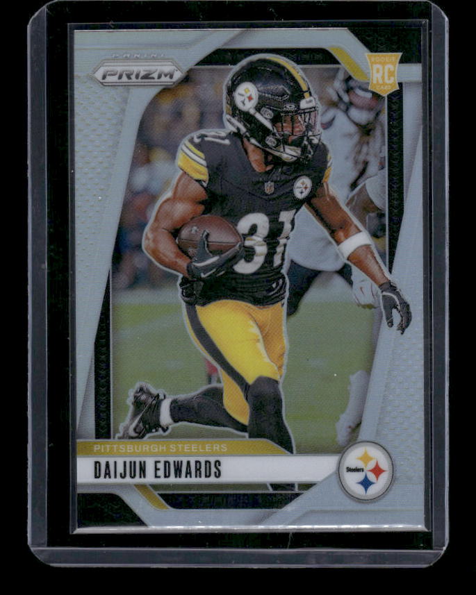 Daijun Edwards' 2024 Panini Prizm Silver Prizm Rookie card features a sleek silver prizm parallel that highlights his entry into professional football. This rookie card combines Panini Prizm’s reflective finish with a clean, modern design, making it a valuable addition for collectors focused on emerging talent. Its premium aesthetics and rookie status position it as a key piece for expert collectors building a forward-looking football card collection.