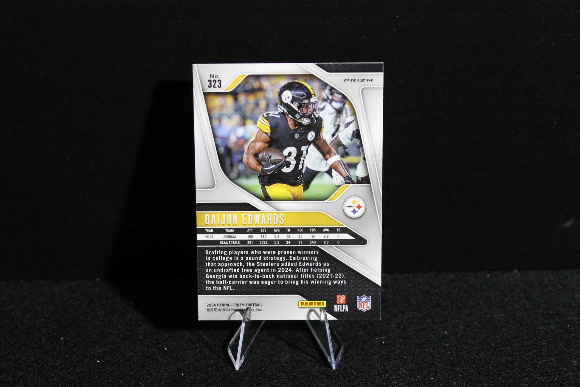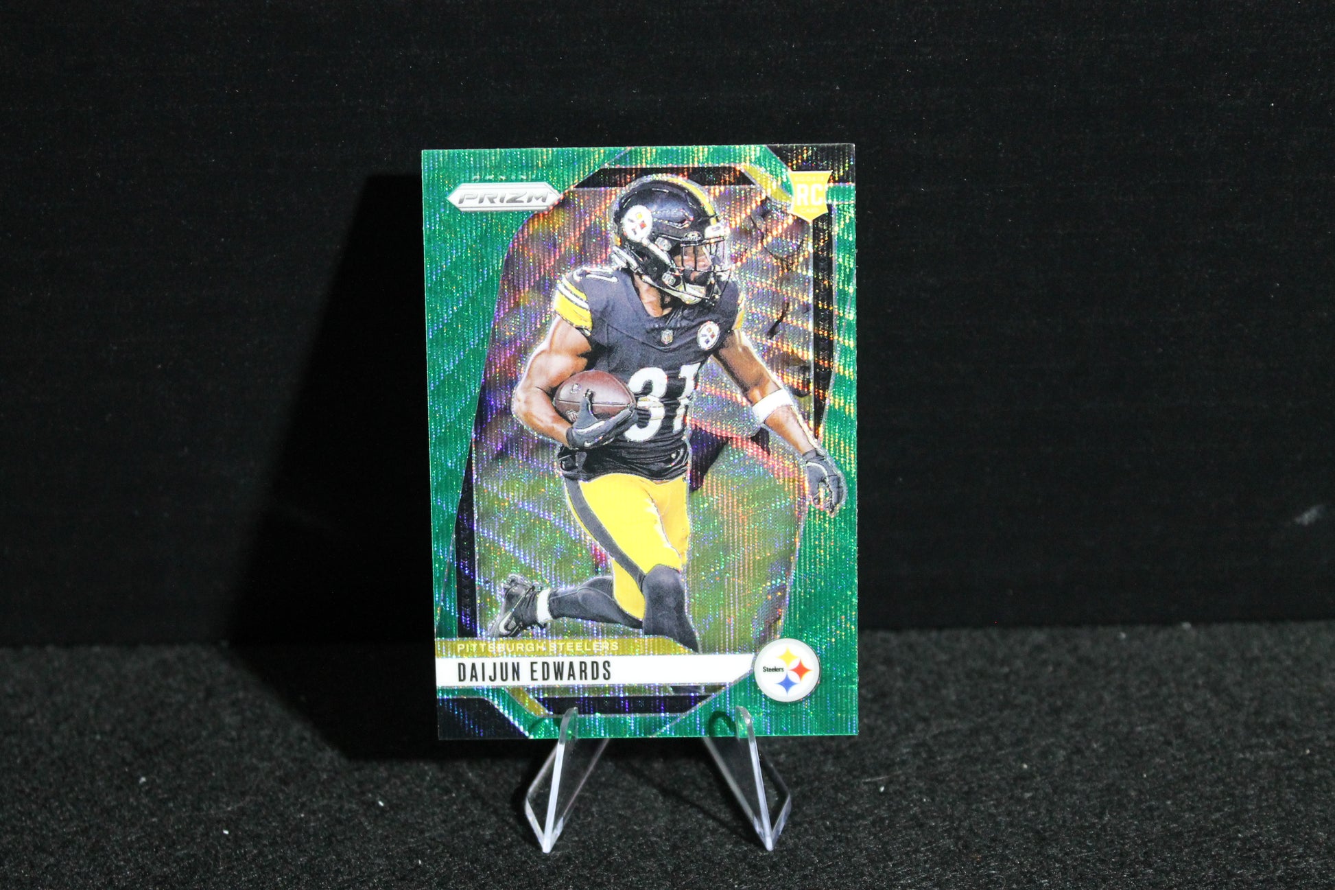 This 2024 Panini Prizm Green Wave Rookie card features Daijun Edwards, showcasing the distinctive wave pattern refractor effect in vibrant green. Part of the highly sought-after Prizm series, this rookie card combines premium card stock with the eye-catching prismatic finish that collectors value. A must-have addition for football card enthusiasts tracking emerging talent.